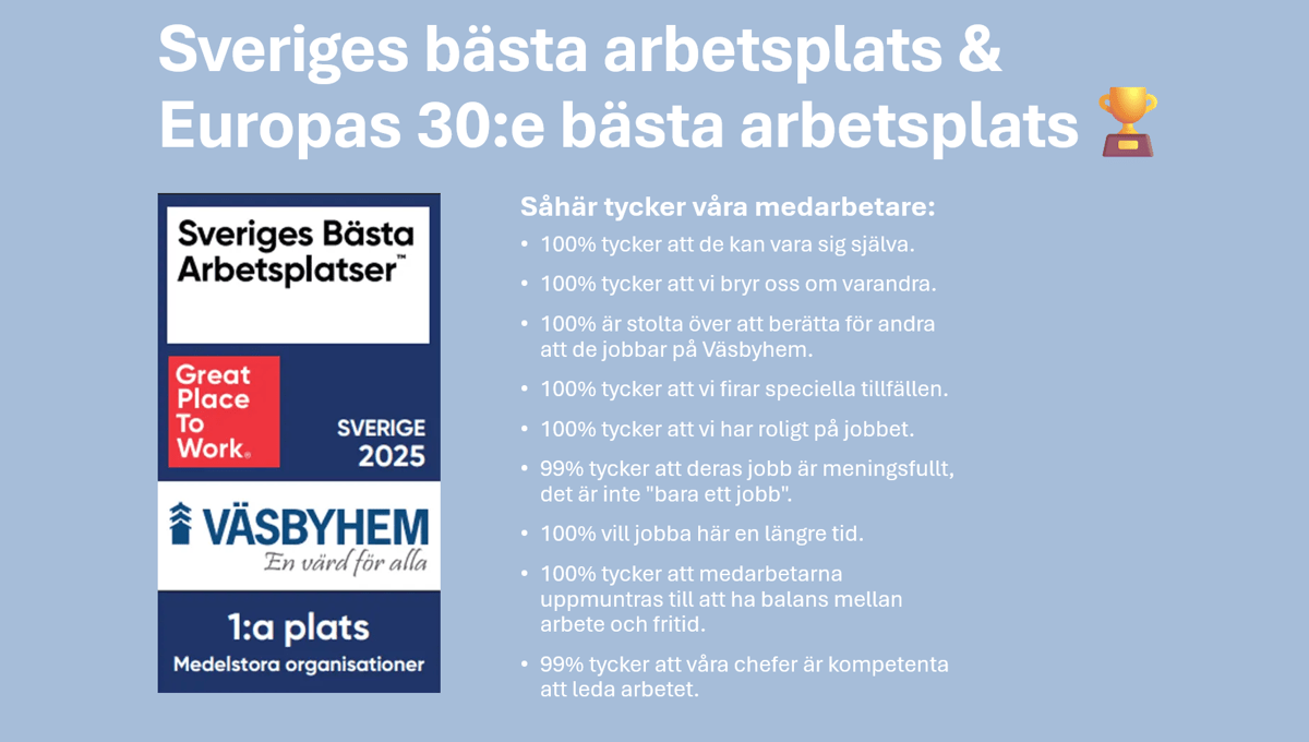Enligt Great Place to Work är vi Sveriges bästa arbetsplats och Europas 30:e bästa arbetsplats. Förutom det är vi även utsedda till Karriärföretag 2026 som en attraktiv arbetsgivare där människor ges utrymme att utvecklas. Vi är stolta över vår starka gemenskap där omtanke, samarbete och arbetsglädje genomsyrar allt vi gör. Här stöttar vi varandra, har roligt tillsammans och vågar testa nya idéer – vi lär oss och utvecklas tillsammans!